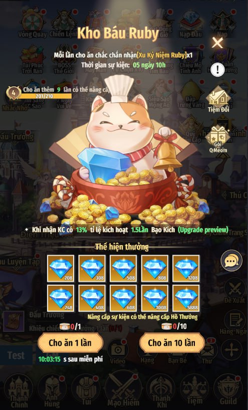 - Tiêu hao hộp đồ ăn mèo để cho ăn, nhận số KC và Xu Kỷ Niệm Ruby, dùng Xu Kỷ Niệm để đổi vật phẩm trong Tiệm Đổi