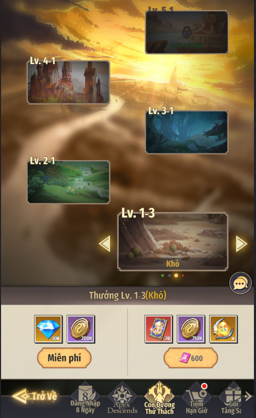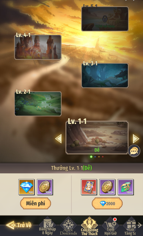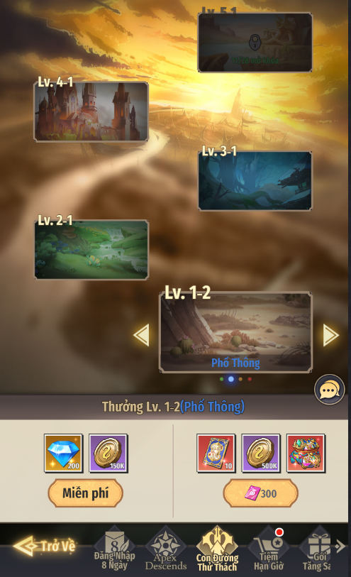 - Mức độ Dễ 1-1: Sau khi vượt ải, có thể nhận miễn phí Vàng và Kim Cương. Có thể dùng Kim Cương để nhận thêm thưởng gồm Vé Mới Khách Quý, Vàng, Đá Tăng Bậc