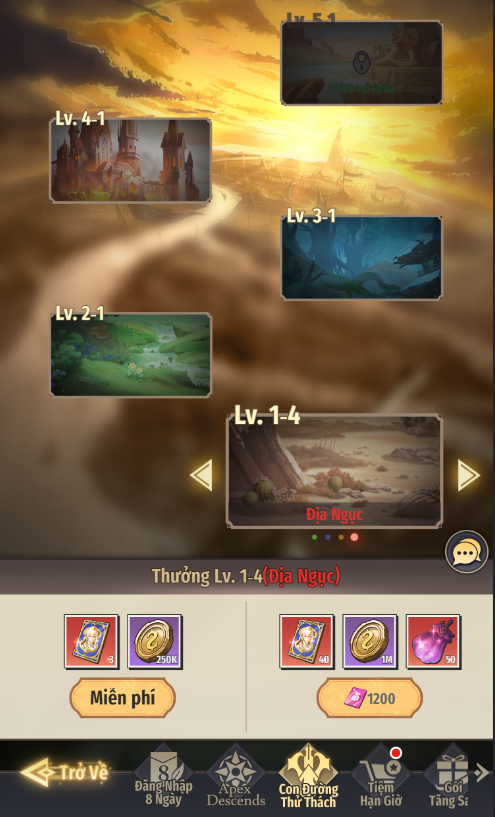 - Mức độ Địa Ngục 1-4: Sau khi vượt ải, có thể nhận miễn phí Vàng và Vé Mới Khách Quý. Có thể dùng Ruby để nhận thêm thưởng gồm Vé Mới Khách Quý, Vàng, Quả Thức Tỉnh