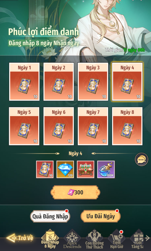 - Hàng ngày nhận thưởng miễn phí Kim Cương, Đá Tăng Bậc, Vé Mới Khách Quý. Có thể dùng Ruby để mua thêm phần thưởng để nhận thêm Vé Mới Khách Quý, Mảnh Khách Quý, Linh Khí của Khách Quý,...