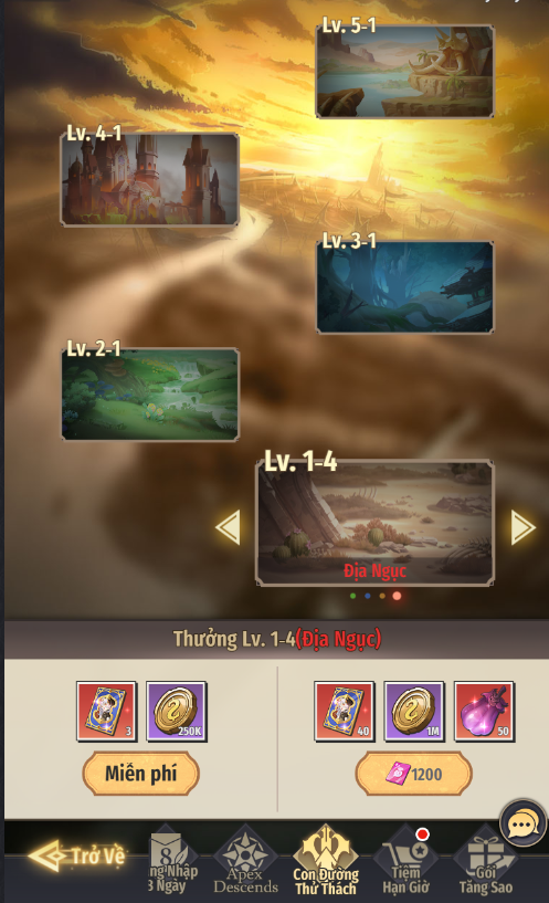 - Mức độ Địa Ngục 1-4: Sau khi vượt ải, có thể nhận miễn phí Vàng và Vé Chiêu Mộ Hư Không. Có thể dùng Ruby để nhận thêm thưởng gồm Vé Chiêu Mộ Hư Không, Vàng, Quả Thức Tỉnh