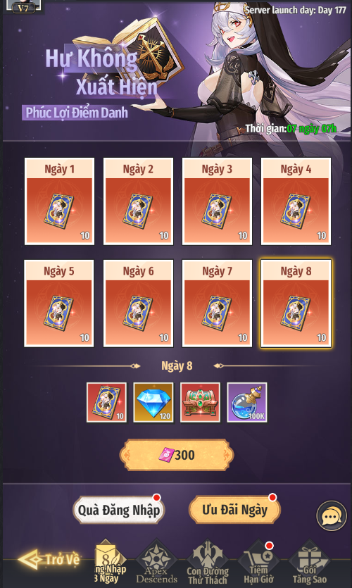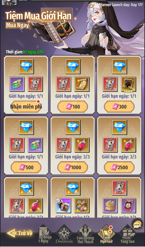 - Hàng ngày nhận thưởng miễn phí Kim Cương, Đá Tăng Bậc, Vé Chiêu Mộ Hư Không. Có thể dùng Ruby để mua thêm phần thưởng để nhận thêm Vé Chiêu Mộ Hư Không, Mảnh Teresa, Linh Khí của Teresa,...