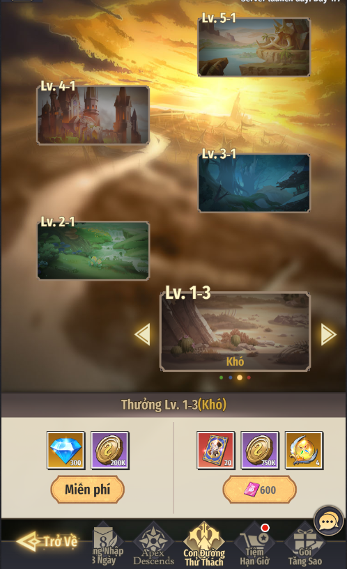- Mức độ Khó 1-3: Sau khi vượt ải, có thể nhận miễn phí Vàng và Kim Cương. Có thể dùng Ruby để nhận thêm thưởng gồm Vé Chiêu Mộ Hư Không, Vàng, Đá Tăng Bậc, Ngọc Hồn Hệ Tự Nhiên